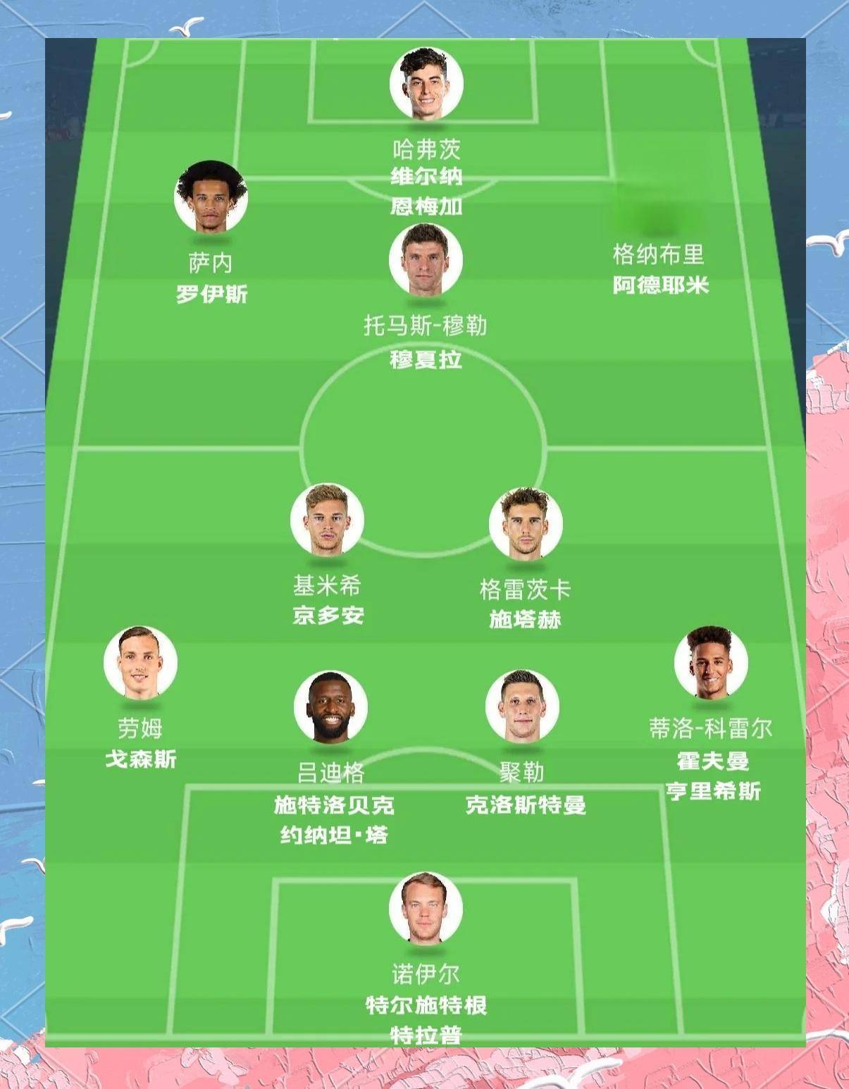 从这些热身赛的主力框架和换人模式看,2026世界杯核心23人名单已经初现雏形。预测首发阵容为4-3-3阵型,门将位置上霍芬海姆的鲍曼凭借预选赛的稳定表现锁定主力,后防四人组中左后卫米特尔施泰特的往返能力与精准传中,搭配右后卫基米希的攻防一体属性。前场三叉戟中,穆西亚拉的灵动盘带与维尔茨的致命直塞,构成了德国队进攻的核心引擎。
